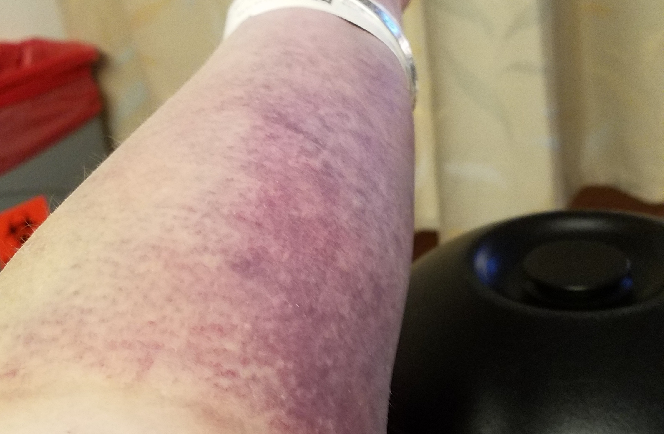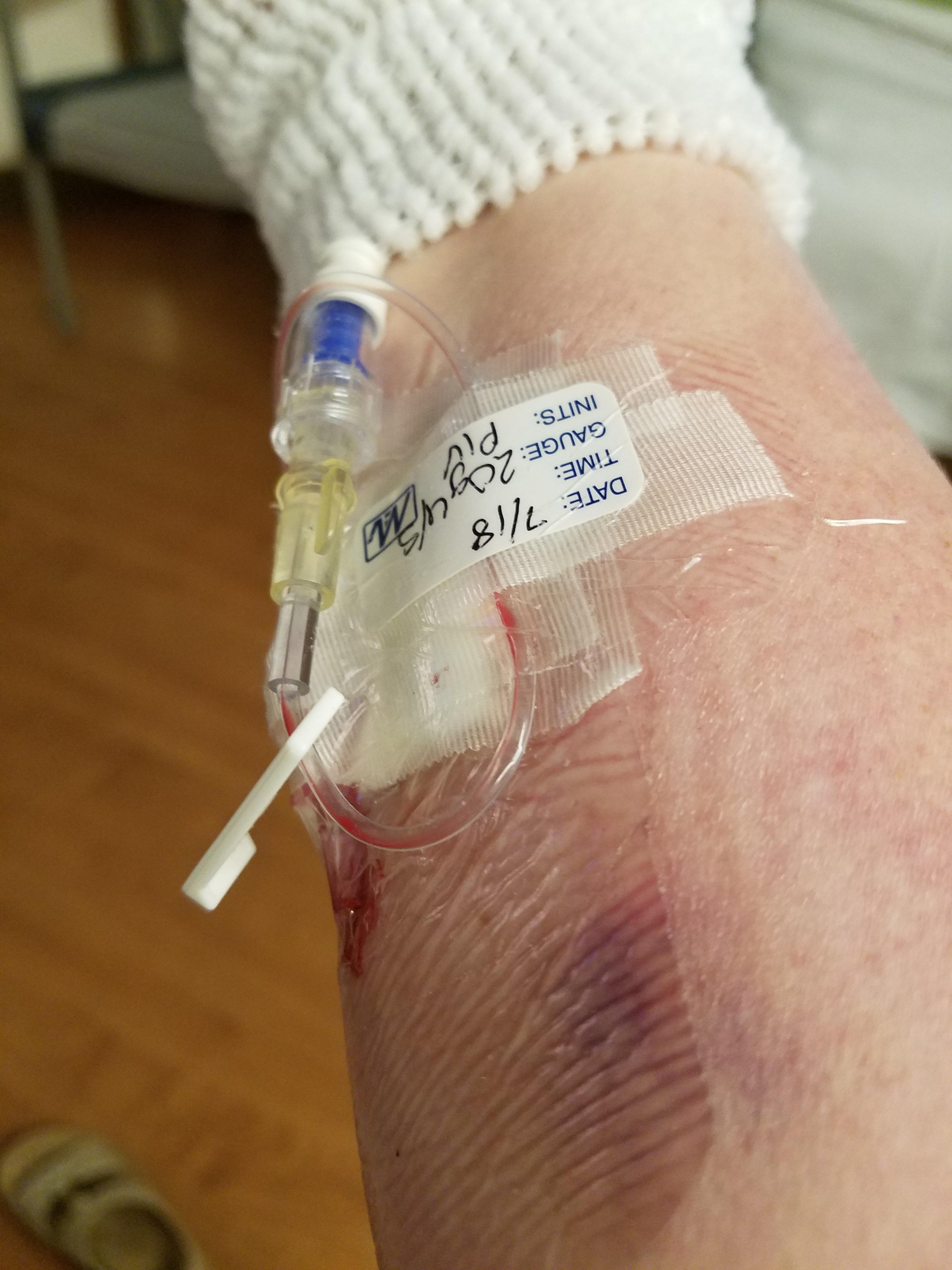 My whole arm up to my elbow became an ugly dark purple for almost a week… The pictures make it look better than what it really was. They had to keep an Iv in me so they switched arms.